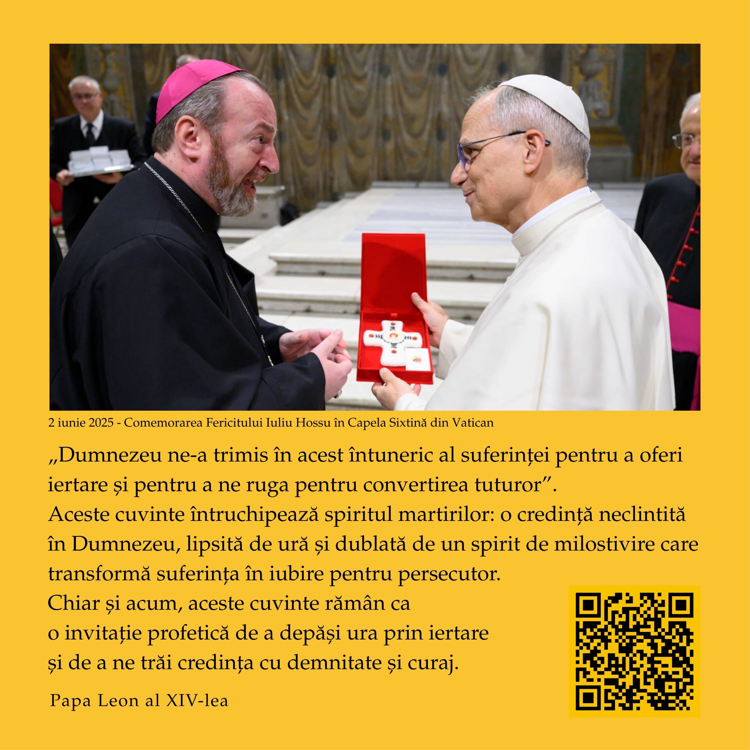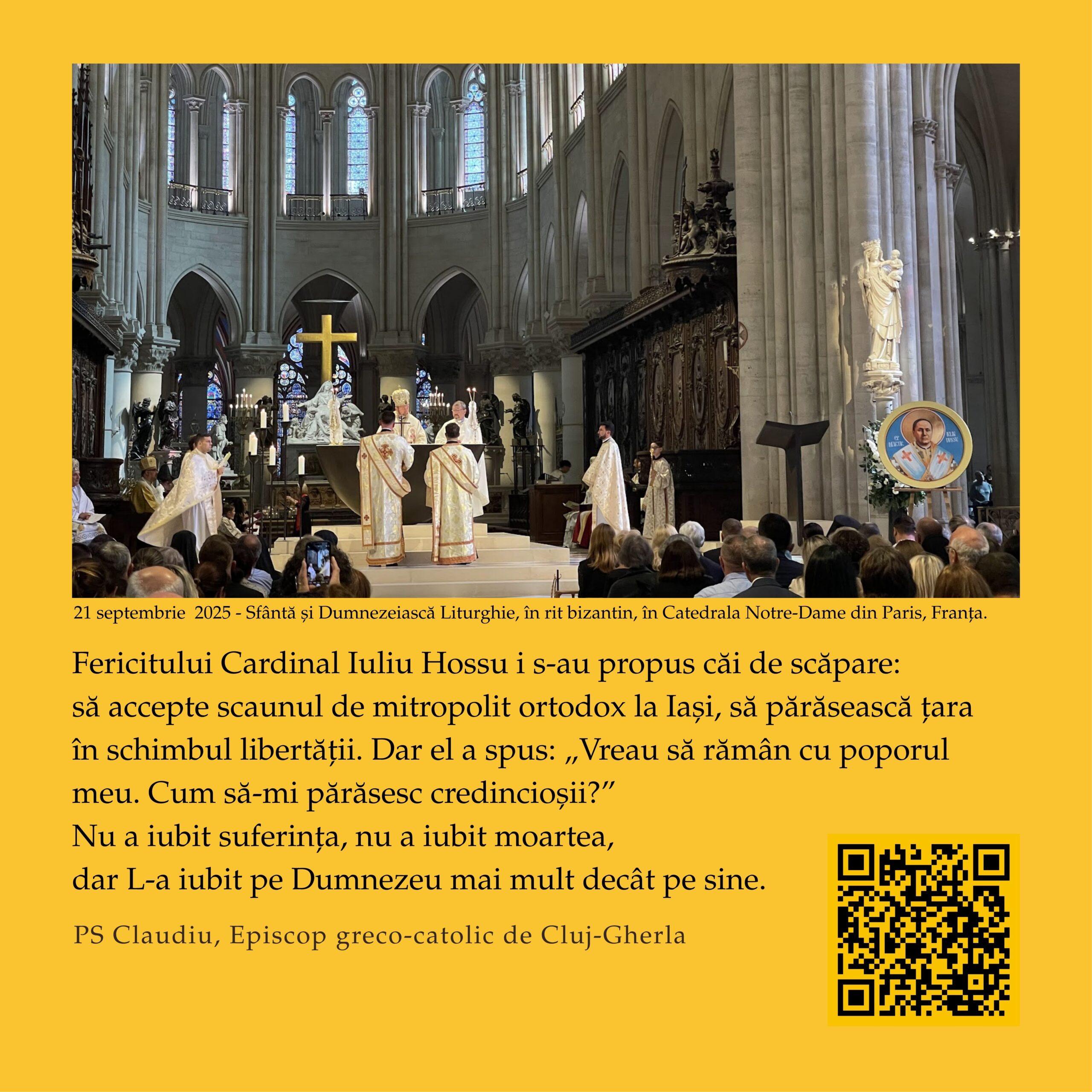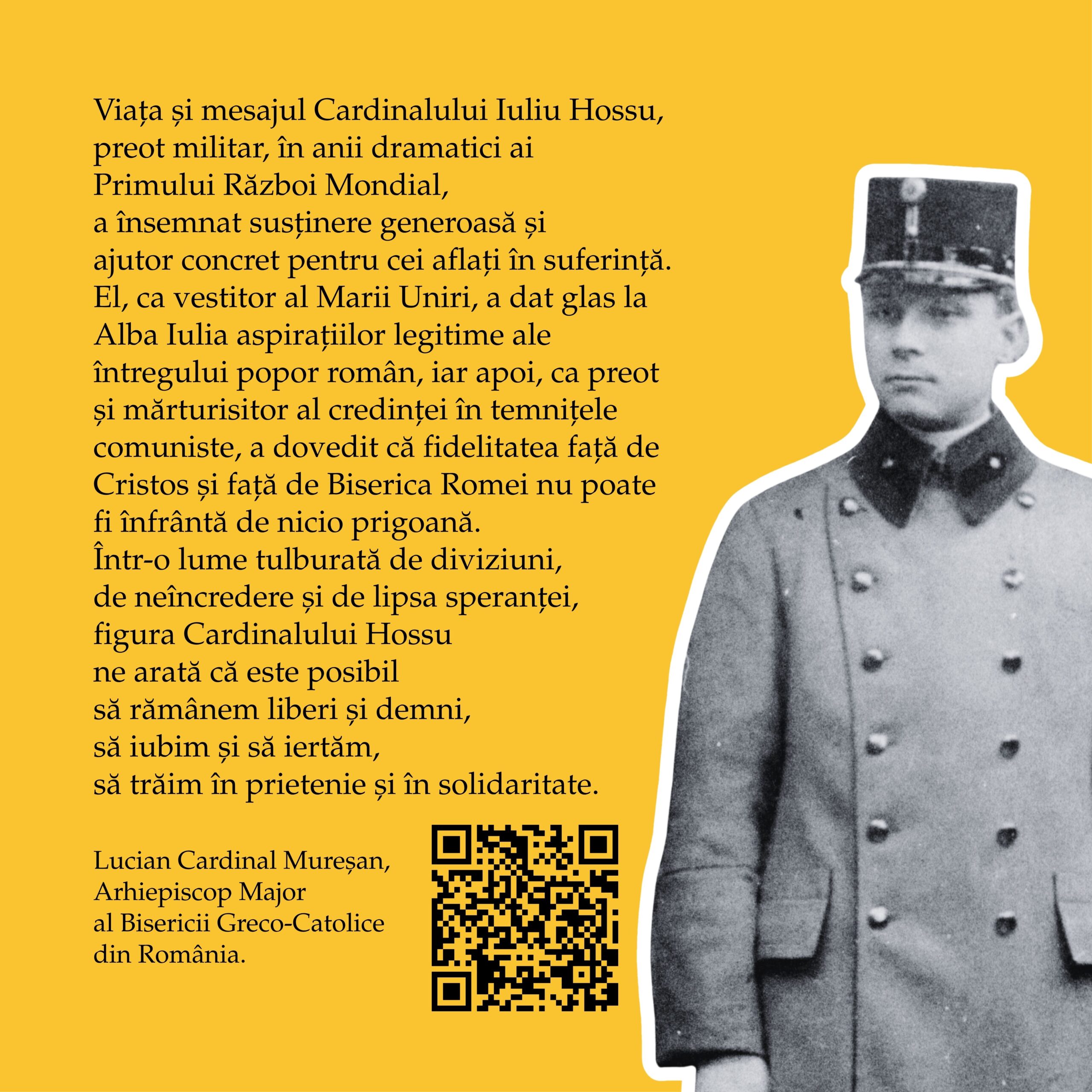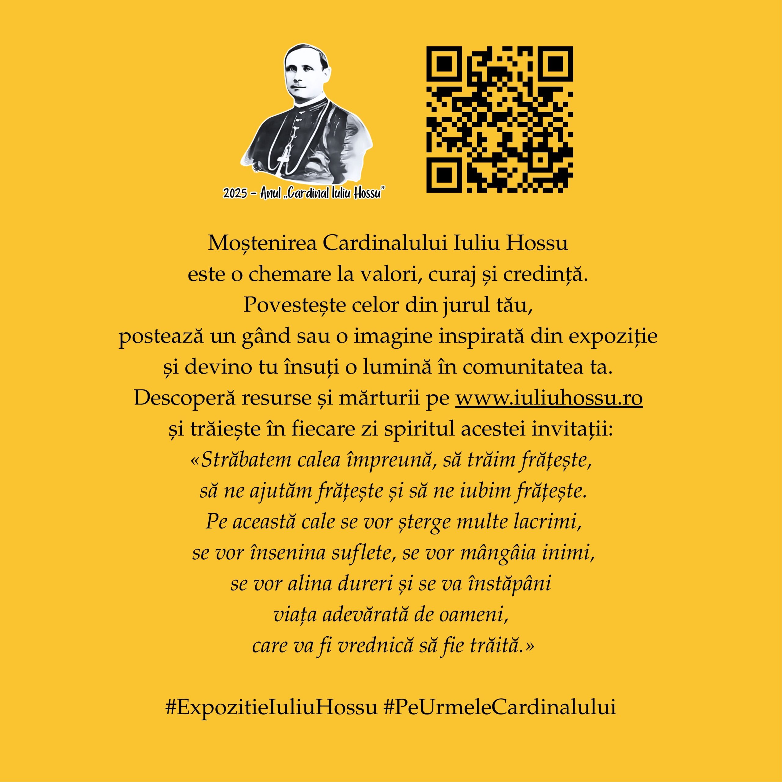 În perioada 1 – 11 octombrie 2025, pe instalația 10×10 a Muzeului Național de Istorie a Transilvaniei (Bd. Eroilor, Cluj-Napoca), publicul este invitat să viziteze expoziția interactivă „Fericitul Cardinal Iuliu Hossu – O viață întreagă pentru Biserică și România”, dedicată unuia dintre cei mai mari păstori și mărturisitori ai credinței din secolul XX.